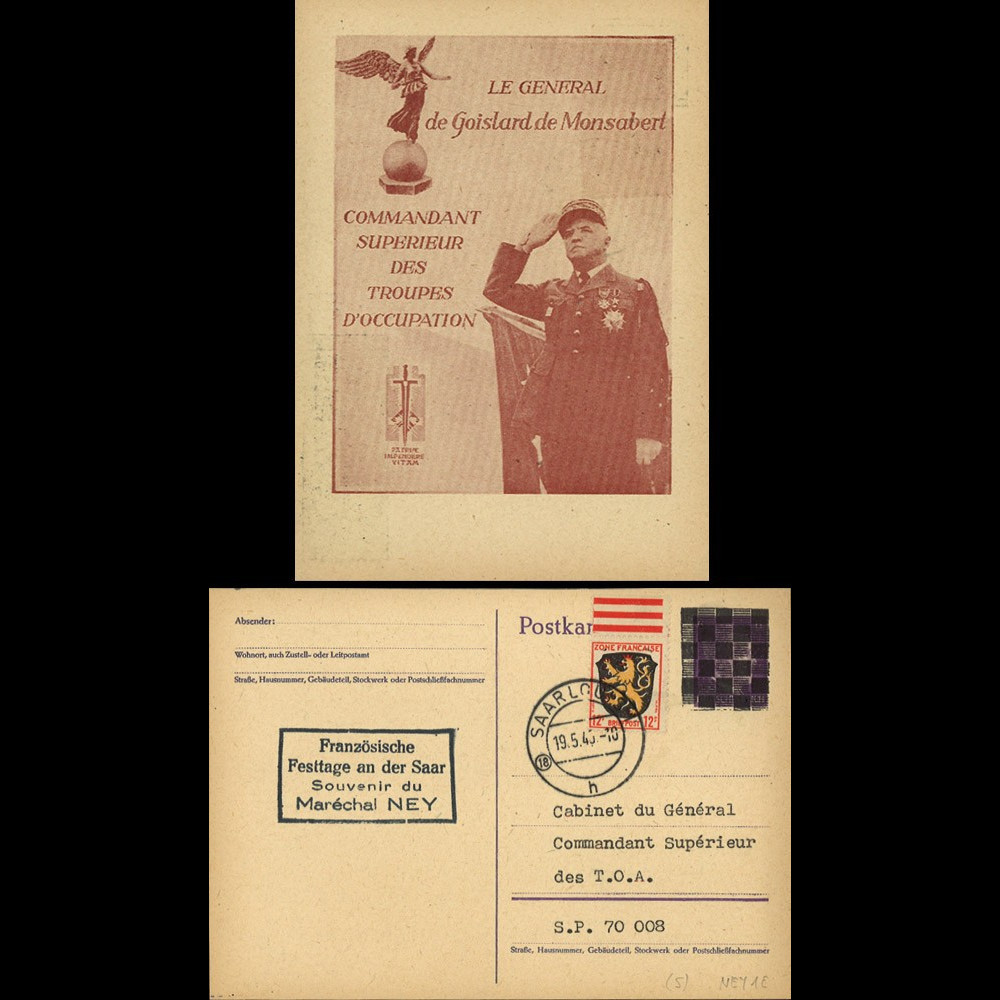 NEY46-1E : Prepaid card Postkarte 6Pf violet overload “Hitler caged“ (P299) “General de Goislard de Monsabert, Senior Commander of the French Occupation Troops“