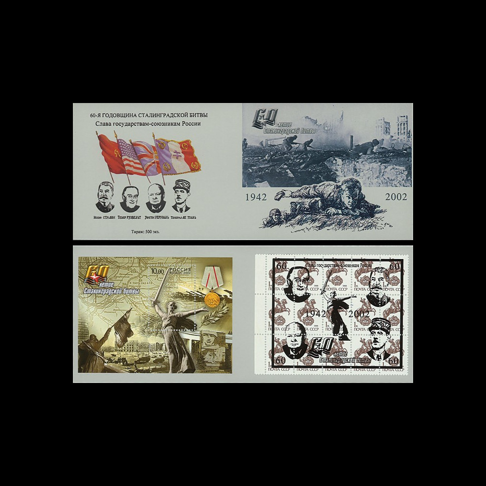 STAL02-C1 : Booklet N°1 (no folded) “60th anniversary of the Battle of Stalingrad 1942 - 2002” Heads of the Allied Nations of the URSS : Staline, Roosevelt, Churchill, de Gaulle Containing the Russian block 10.00R “Stalingrad” + 1 block de 15 stamps of ex-URSS (type 1) 1k brown 1988 “Messenger and coat of arms” overturned “Heads of State”