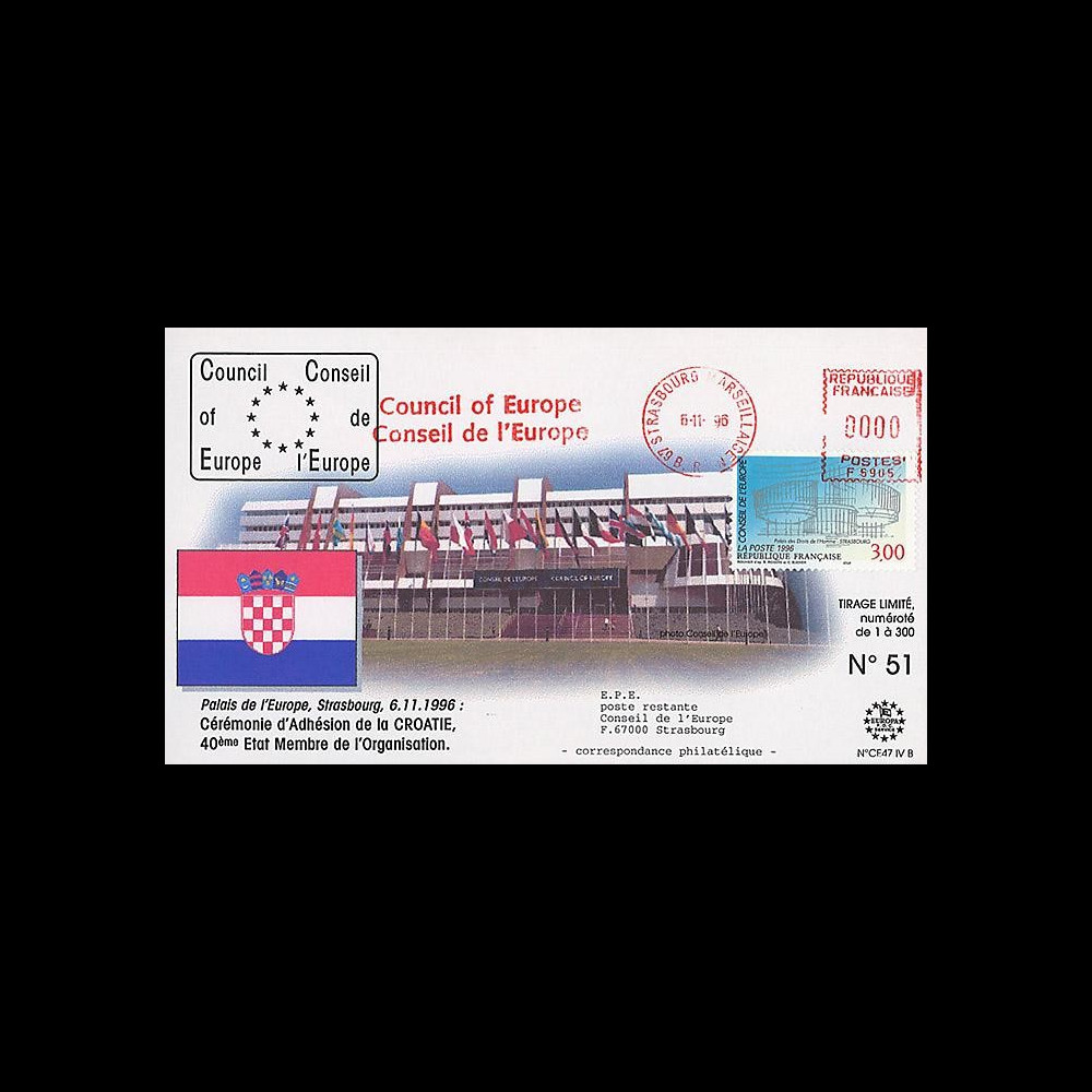 N°CE47-IVB: Envelope (FDC) 6.11.1996 "Ceremony of adhesion Croatia at the European Council, 40th State Member of the Organisation". Service stamp European Council 3,00F "New Palace of the Human rights"