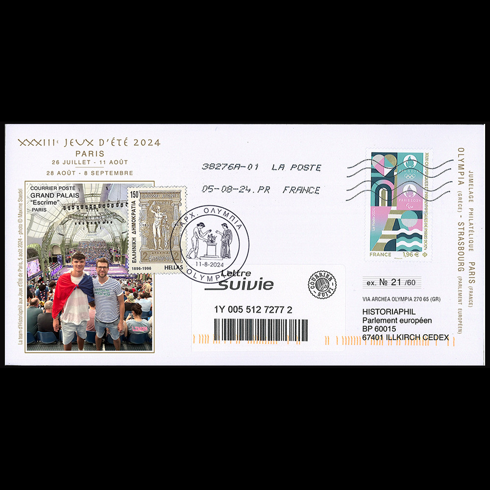 Unique philatelic covers, sent from Olympia (Greece) to Paris (France), were produced in very small print runs by Historiaphil© (European Parliament Philatelic Kiosk, Strasbourg) to celebrate this historic event.
