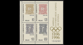 Visuals of the 12 Greek "Olympic Games" stamps from 1896 (N°101/112) used on the 3 Centenary blocks of 1996: 1l, 2l "Wrestlers", 5l, 10l "Discobolus", 20l, 40l "Amphora of the Panathenaia" , 25l, 60l "The White Quadriga and the Winged Victory", 1d "The Stadium and the Acropolis", 2d "Hermes after Praxiteles", 5d "The Victory of Peonias", 10d "The Acropolis and the Parthenon" .