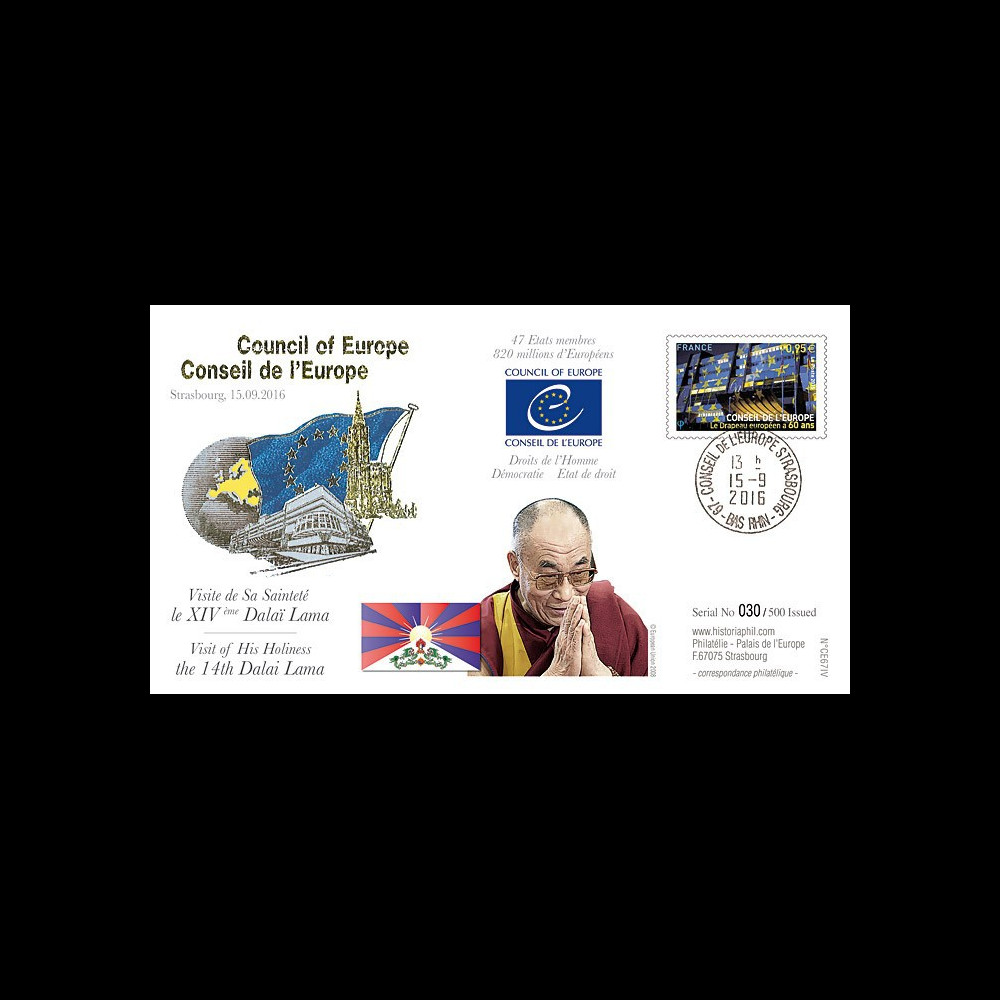 N°CE67-IV : FDC 'Premium Edition' Council of Europe to Strasbourg (France) "September 15, 2016 : Visit of His Holiness the 14th DALAI LAMA (Tibet) to the European Parliament in Strasbourg"
