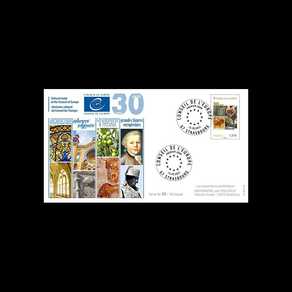 N°CE68-PJ : FDC FIRST DAY of the new service stamp of the Council of Europe to Strasbourg (France) October 13, 2017 "1987-2017 : COUNCIL OF EUROPE 30 years of Cultural Routes"