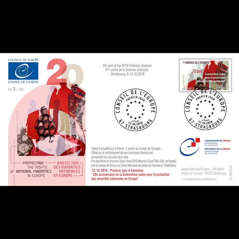 N°CE69-PJ : FDC FIRST DAY of the new service stamp of the Council of Europe to Strasbourg (France) October 12, 2018 "1998-2018 : 20 years of the Framework Convention for the Protection of National Minorities / PACE session 8-12.10.2018"