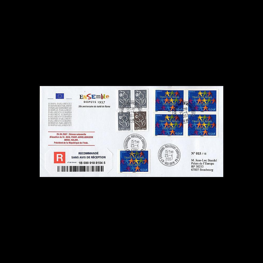 N°PE537a: service envelope of the European Parliament forwarded in REGISTERED «Allocution of the Dr. Avul Pakir Jainulabhudin Abdul Kalam, President of the Indian Republic» Small cancellation TAD «European Parliament, Strasbourg» 25.04.07 on block of 4 + 1 PS 0,54 EUR «Treaty of Roma 1957-2007»