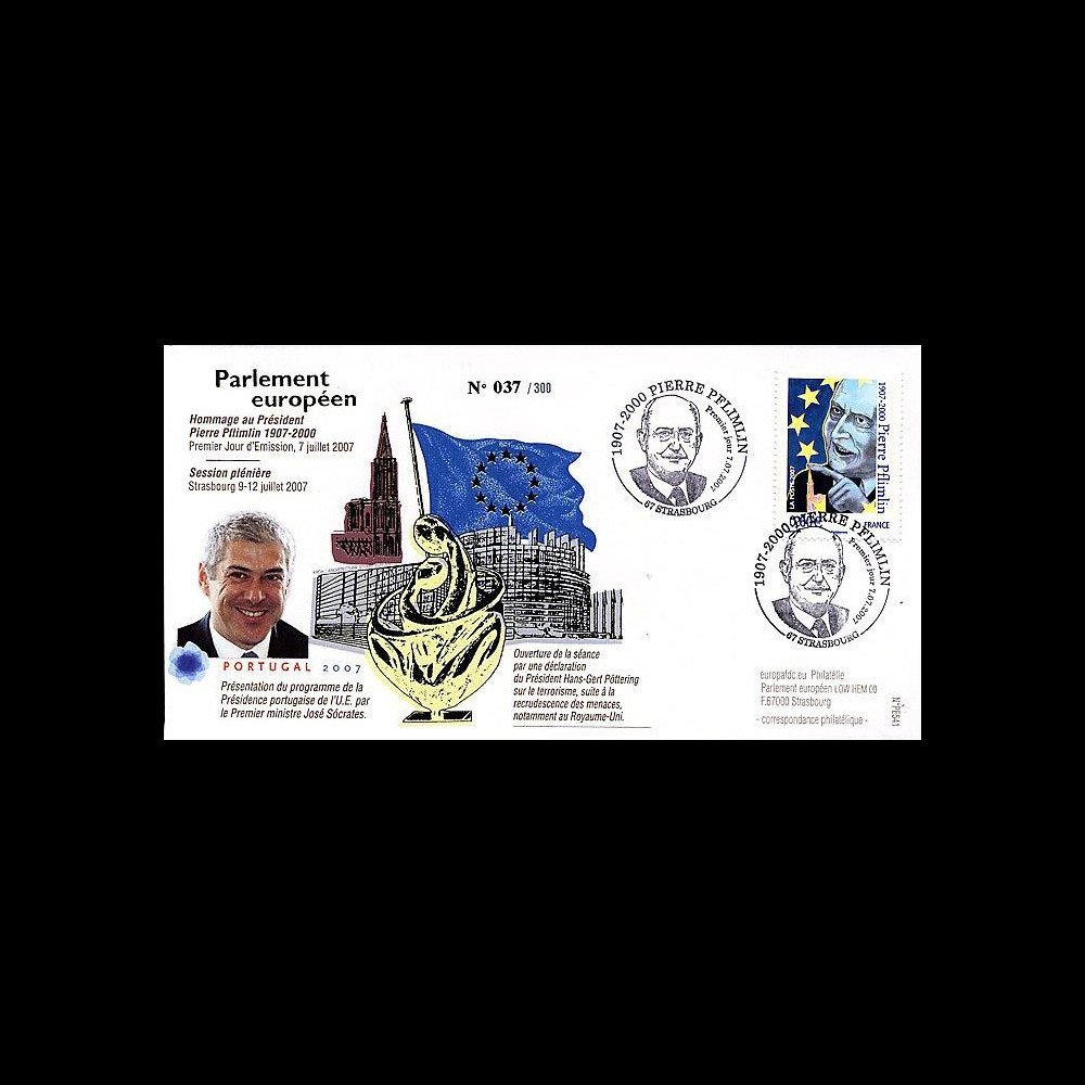 N°PE541: FDC Session of the European Parliament - July 2007 - Presentation of the programm of the Portuguese Presidency of the EU by the First Minister José SOCRATES - Homage to the President Pierre Pfimlin 1907-2000 - Declaration of the President Hans-Gert Pöttering about the terrorism, following the recrudescence of the threats in particular in England.