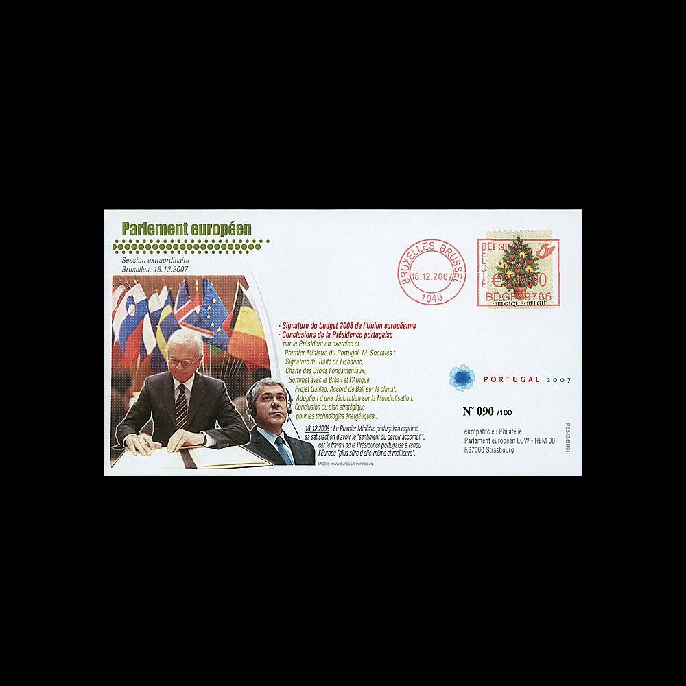 N°BR91 : FDC "session of the European Parliament of Bruxelles - December" "- Signature of the budget 2008 of the European Union - Conclusions of the Portuguese Presidency by the President in exercise and First Minister of Portugal, M. Socrates : signature of the Treaty of Lisbon, Charter of the Fundamental Rights, Summit with Brazil and Africa, project Galileo, agreement of Bali about the climate, adoption of a declaration about the Globalization, conclusion of the strategic plan for the energetic technologies "