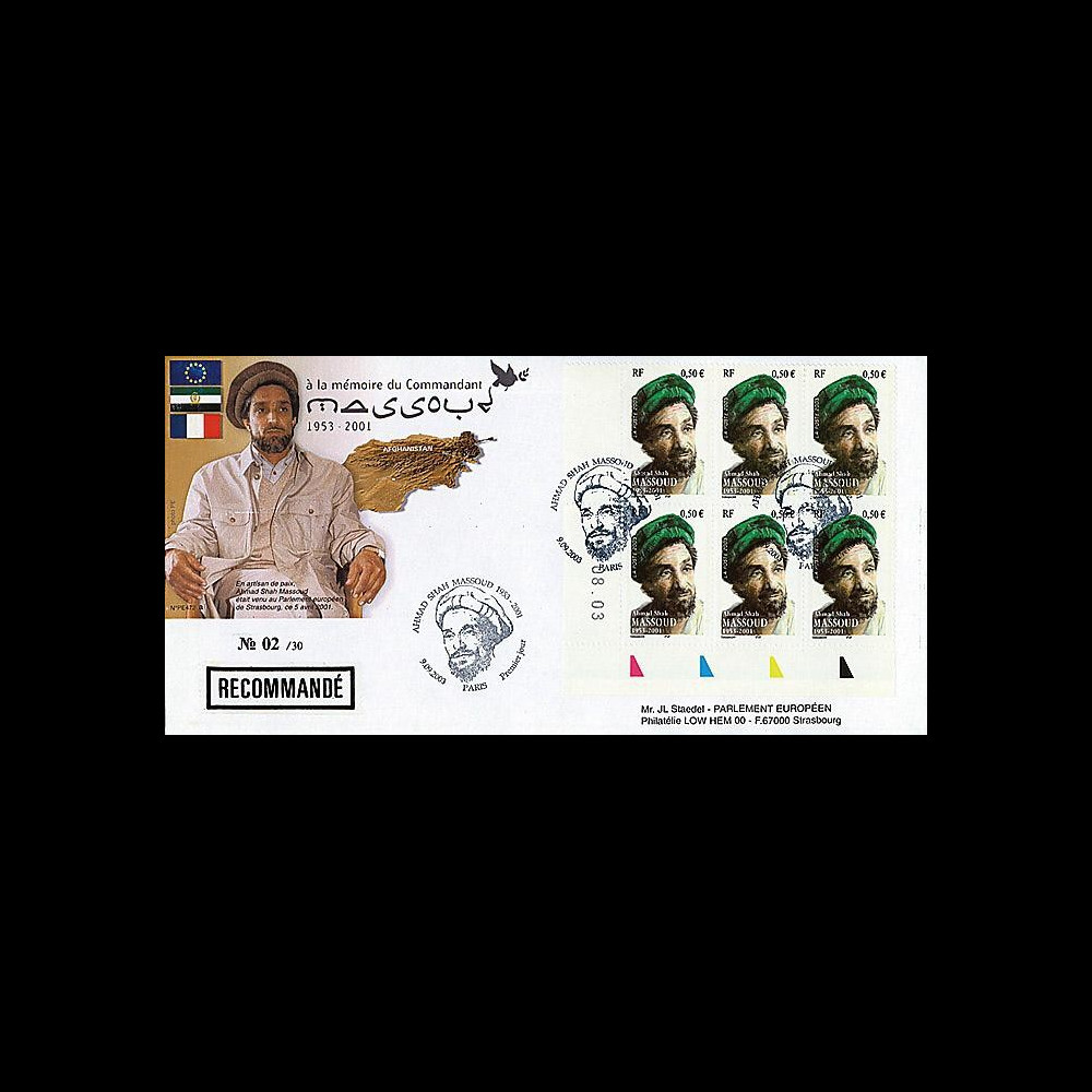 Le timbre français «Ahmad Shah MASSOUD 1953-2001» de l'artiste Taraskoff a été présenté officiellement dans l'espace philatélie du bâtiment Louise Weiss, lors de la session plénière du Parlement européen à Strasbourg (22-25.9.2003). A la mémoire du Commandant Massoud (1953-2001)Pour ses enfants, pour son pays, Ahmad Shah Massoud rêvait de la paix. En 1979, l'URSS envahit l'Afghanistan. Massoud, surnom qui signifie le chanceux, prend les armes avec quelques maquisards. Cet admirateur du Général de Gaulle, ancien élève du lycée français de Kaboul, organise la résistance et lutte contre l'armée rouge avec un arsenal rudimentaire. Malgré les difficultés, la résistance s'amplifie. Et l'incroyable vient. Au bout de dix ans de combats meurtriers, l'Union Soviétique se retire d'Afghanistan.