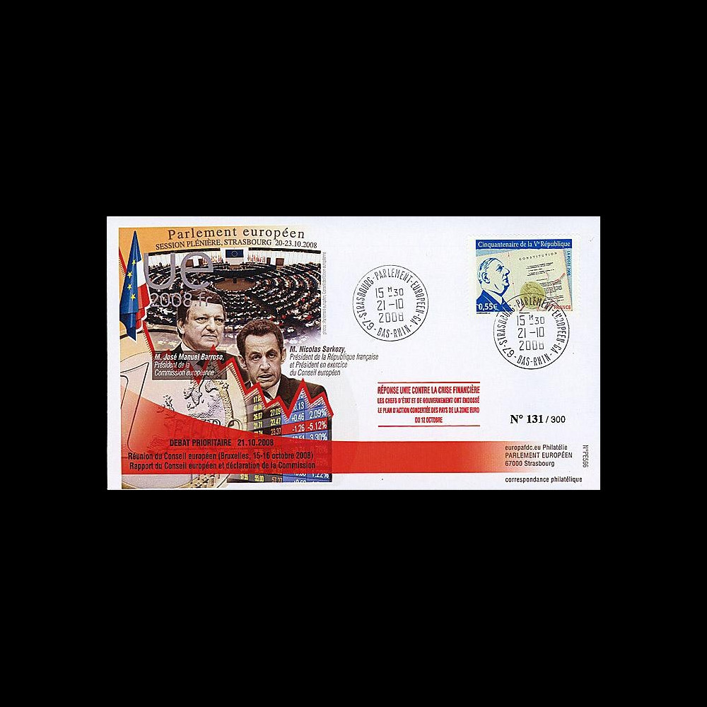 N°PE566T1 : FDC "session of the European Parliament of Strasbourg - 20-23 October 2008" "- Priority Debate about the financial crisis, 21.10.2008 : Assembly of the European Council (Bruxelles, 15-16 October 2008) - report of the European Council and declaration of the Commission - United response against the financial crisis : the heads of State and of the Government took on the action plan concerted of the countries of the euro area on 12 October 2008 - Presence of MM. Nicolas Sarkozy, President of the French Republic and President in exercise of the Council of the European Union and José Manuel Barroso, President of the European Commission - French Presidency of the Council of the European Union"