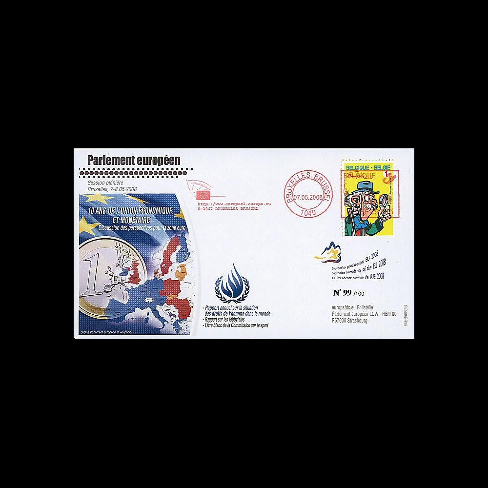 N°BR96-PE560 : FDC "extraordinary session of the European Parliament of Bruxelles - May 2008" '- 10th anniversary of teh Economic aand Monetary Union - Annual Report annuel about the situation of the human rights in the world" 0,52 Belgium "Spirou"