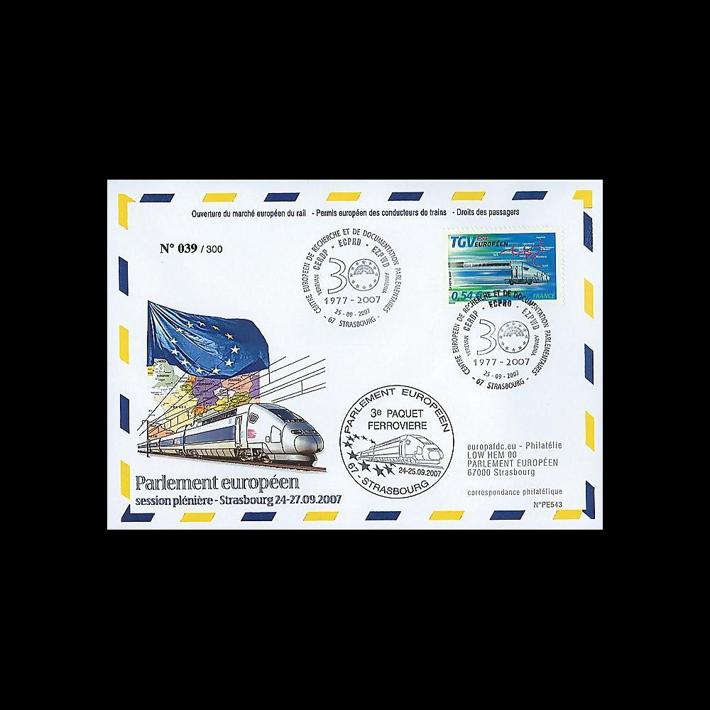 N°PE543 : envelope FDC 'European Parliament, 3rd iron bundle (Opening of the European market of the railway - European permission of the train drivers - Rights of the passengers)' 0,54 EUR 'TGV East European'