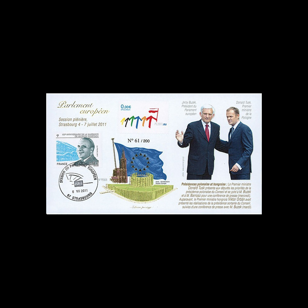 N°PE605 : FDC 'Premium edition' Session of the European Parliament to Strasbourg (France) July 4-7, 2011 "Official visit and speech by Mr. Donald TUSK, Prime Minister of Poland - The Polish Presidency of the Council of the European Union to July 1 - December 31, 2011" :