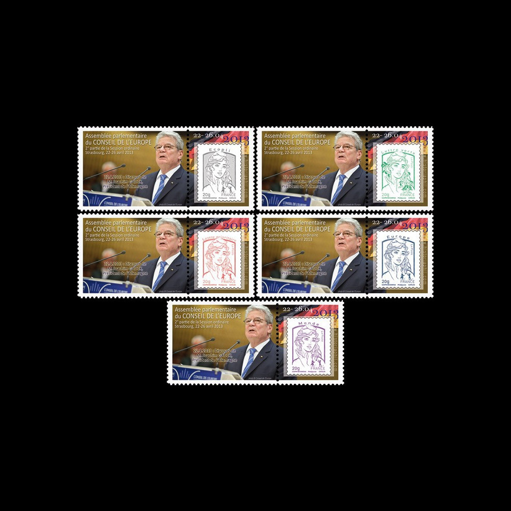 N°CE64-IIAPT1/5 : FRANCE Set of 5 values "Marianne and Youth" on Private Stamp Display Units perforated and gummed Third Part of the regular session of the Council of Europe Parliamentary Assembly to Strasbourg (France) April 22-26, 2013 "April 22, 2013 : Official visit and speech by Mr. Joachim GAUCK, President of Germany" 2013 :
