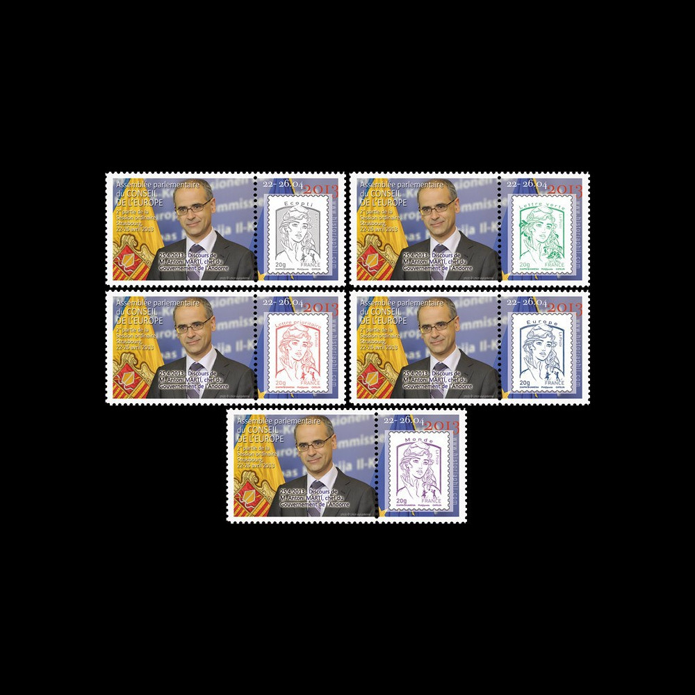 N°CE64-IIDPT1/5 : FRANCE Set of 5 values "Marianne and Youth" on Private Stamp Display Units perforated and gummed Third Part of the regular session of the Council of Europe Parliamentary Assembly to Strasbourg (France) April 22-26, 2013 "April 25, 2013 : Official visit and speech by Mr. Antoni MARTÍ, Head of Government of Andorra" 2013 :