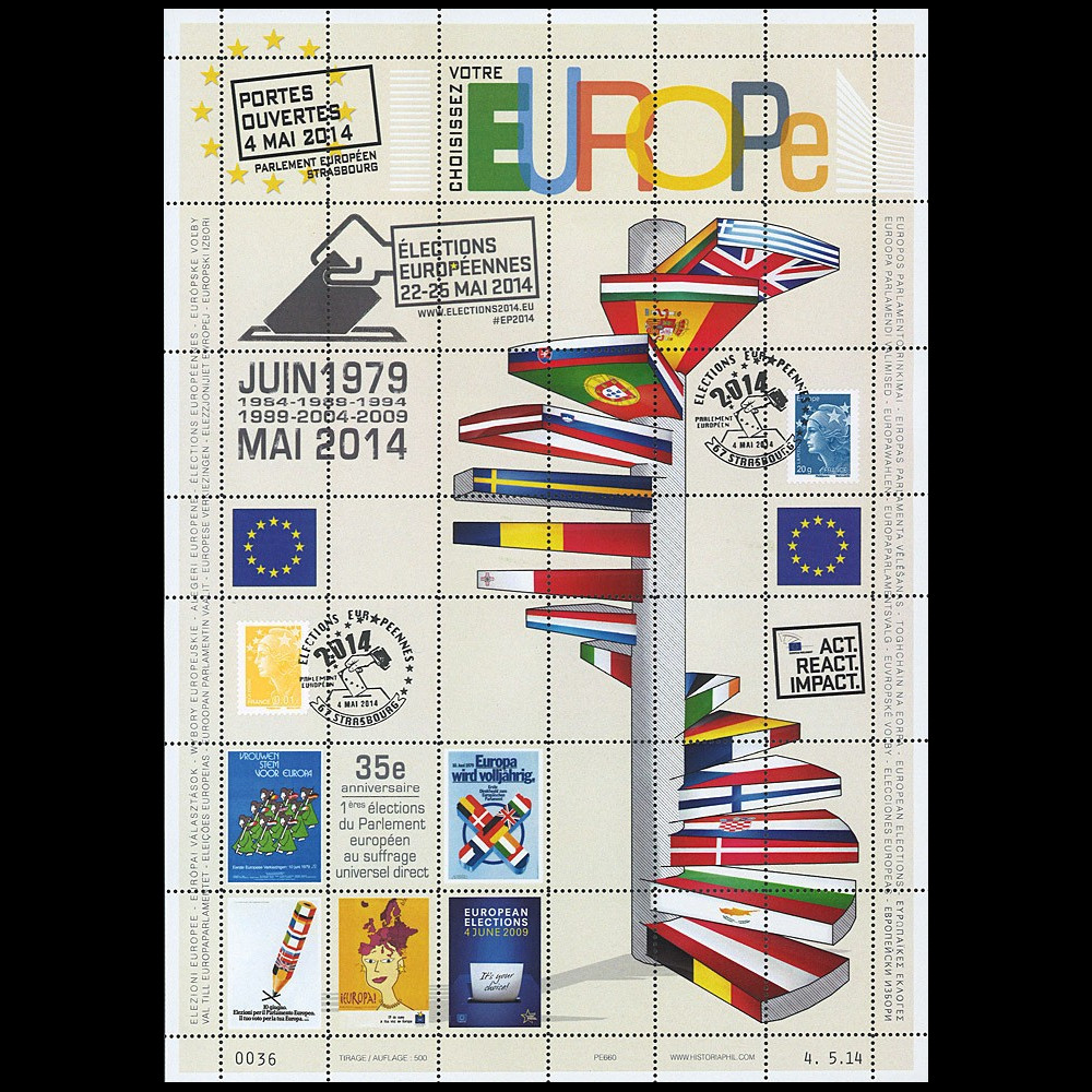 N°PE660 : Sheetlet of 42 labels perforated and gummed FRANCE Open doors in the European Parliament to Strasbourg (France) May 4, 2014 "May 4, 2014 : Special cachet in Strasbourg (France) - European Elections of the European Parliament to Strasbourg / Philatelic Exhibition in the European Parliament to Strasbourg : Choose your Europe - 35th anniversary of the First European Elections to the European Parliament by Direct Universal Suffrage" (Size : 21 x 29,7 cm) 2014 :