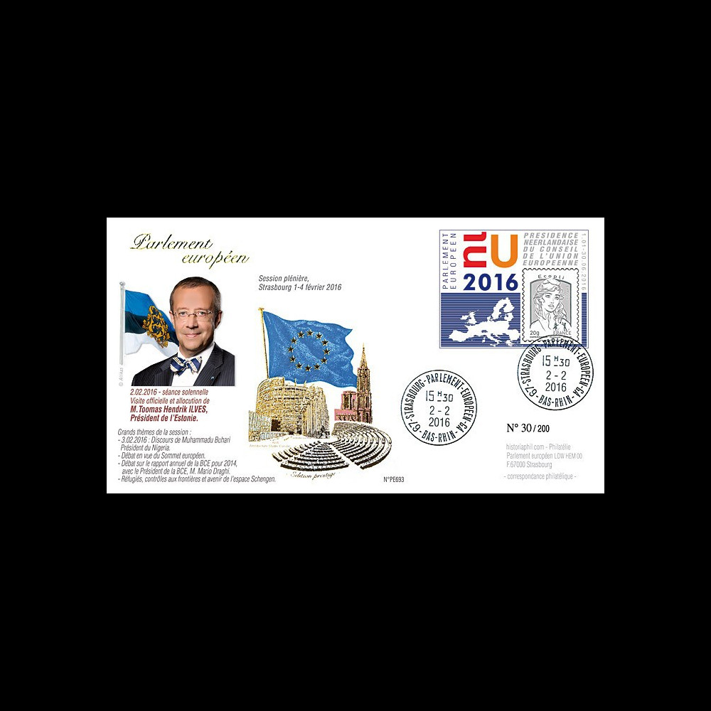 N°PE693 : FDC 'Premium edition' Session of the European Parliament to Strasbourg (France) February 1-4, 2016 "February 2, 2016 : Official visit and speech by Mr. Toomas Hendrik ILVES, President of Estonia" 2016 :