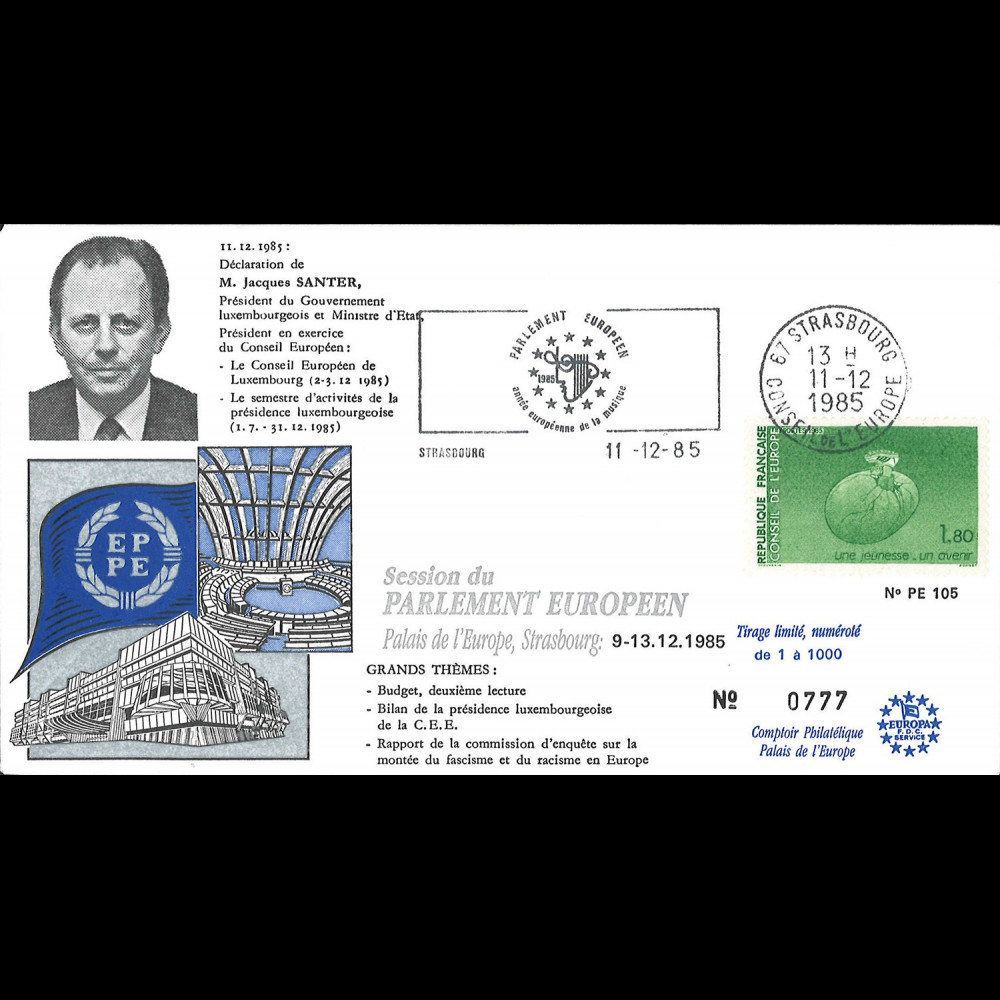 En commémoration de cette journée historique, nous avons réalisé, avec la collaboration du Parlement européen et du service de presse de l'Elysée, une superbe série d'enveloppes philatéliques «Edition Prestige» rehaussées d'une gravure «OR» ou «ARGENT» frappée à chaud, ainsi qu'un timbre à date grand format illustré.