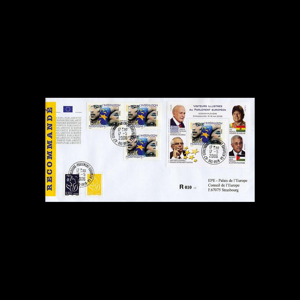 N°PE519a RECO: Official headed Envelope European Parliament forwarded in REGISTERED - Session of the European Parliament - May 2006 "Official Visit and allocution of M. Evo MORALES, President of Bolivia, o M. Mahmoud ABBAS, President of the PAlestinian Autority and of M. Carolos PAPOULIAS, President of the Hellenic Republic"