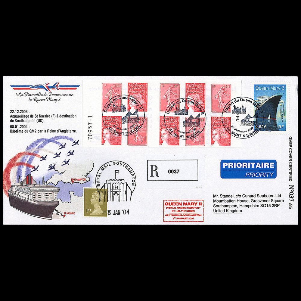 No. QM2-2a: Registered mail, twinned between FRANCE and UNITED KINGDOM, 2003 - "Departure of the ocean liner 'Queen Mary 2' from the Chantiers Navals de l'Atlantique, escorted by the Patrouille de France - Naming of the QM2 by Queen Elizabeth II"