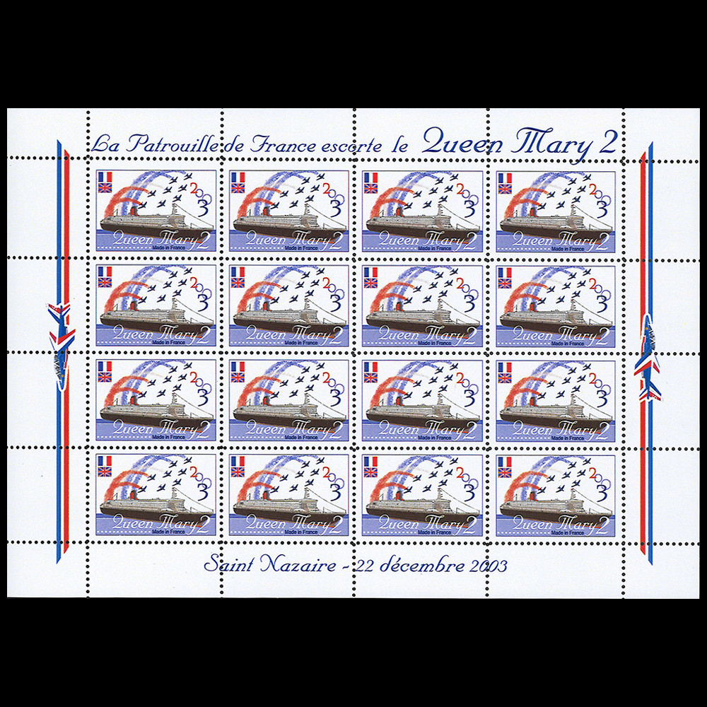 No. QM2-2FD: France 2003 - Sheet of 16 perforated and gummed naval labels (cinderellas) "Departure of the liner 'Queen Mary 2' from the Chantiers Navals de l'Atlantique, escorted by the Patrouille de France - Saint-Nazaire, December 22, 2003"