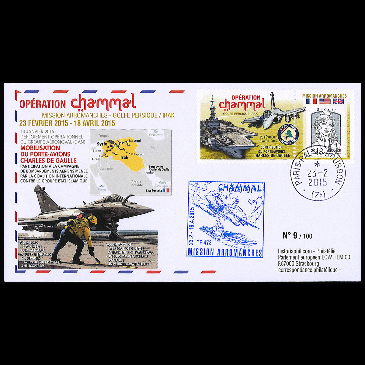 BLUE stamp “CHAMMAL - Mission Arromanches - TF 473 - Aircraft carrier Charles de Gaulle“