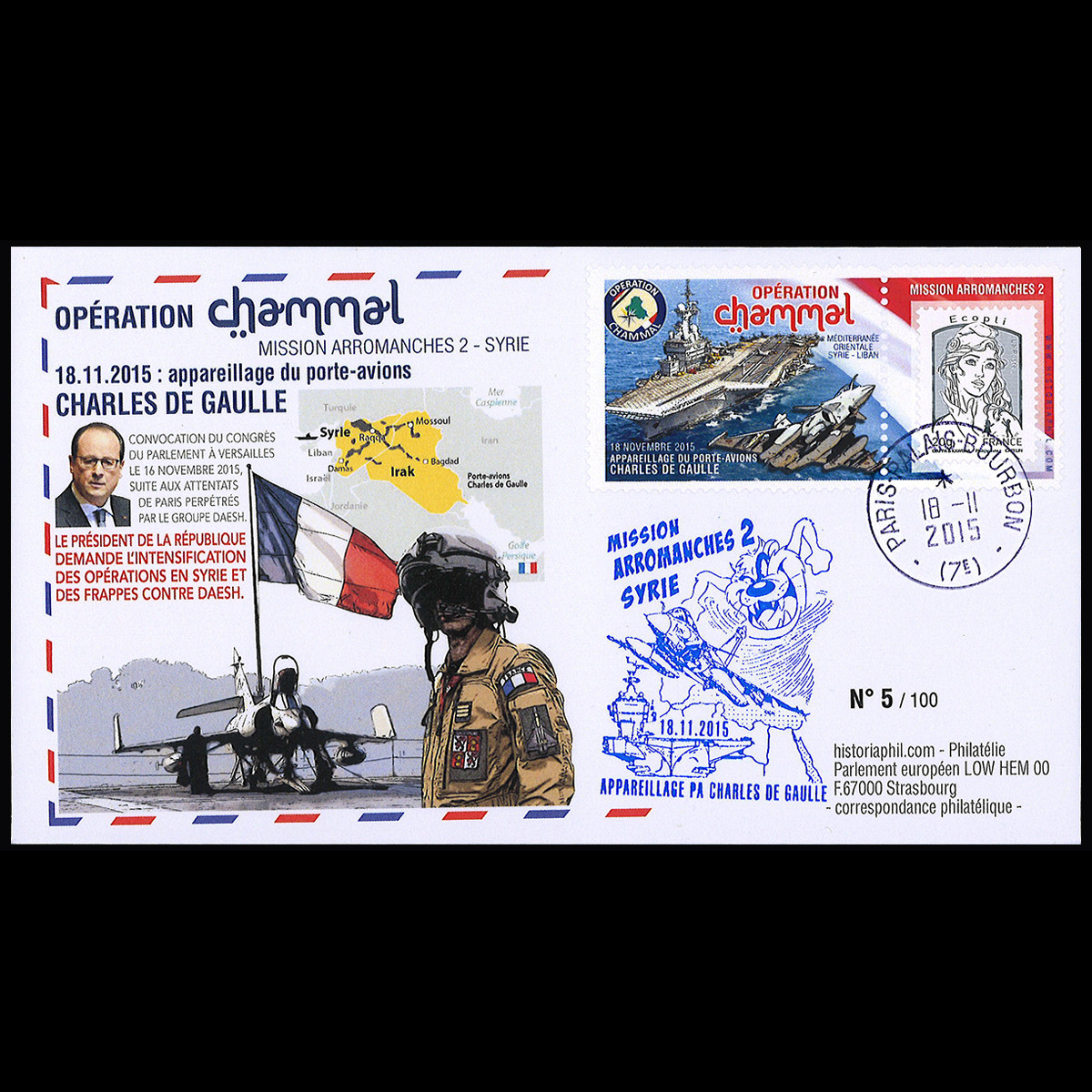 Postage eco 20g "Marianne, 2015" on label stamp holder (cinderella) "Operation CHAMMAL Mission Arromanches-2 SYRIA - LEBANON / Departure of Franch AC Charles de Gaulle 18.11.2015 / Rafale aircraft"