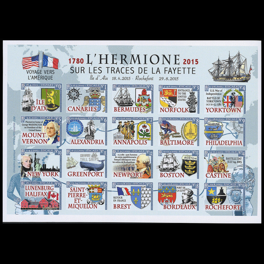 NAVAL LABELS - Sheet of 25 IMPERFORATED and gummed cinderellas "18.04-29.08.2015: 235 years after the Marquis de LA FAYETTE (1780) - Maiden voyage of the French Liberty Frigate L'HERMIONE to the United States (USA) - Departure from Île d'Aix (France) and return to Rochefort (France) / American War of Independence / George WASHINGTON, First President of the United States"