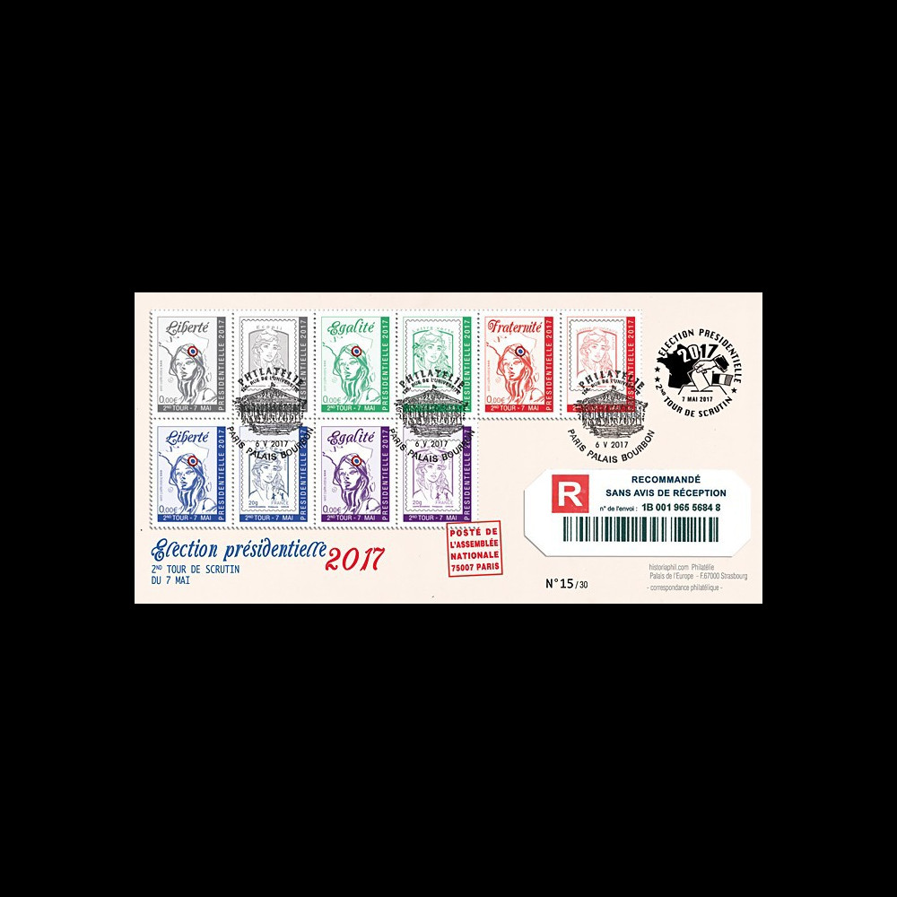 N°PRES17-6REC : FRANCE Registered envelope “Presidential Election 2017 - 2nd ROUND May 7“ with sheetlet of 10 labels "Marianne de Staedel 2017 © and values of the Republic Freedom, Equality, Fraternity"