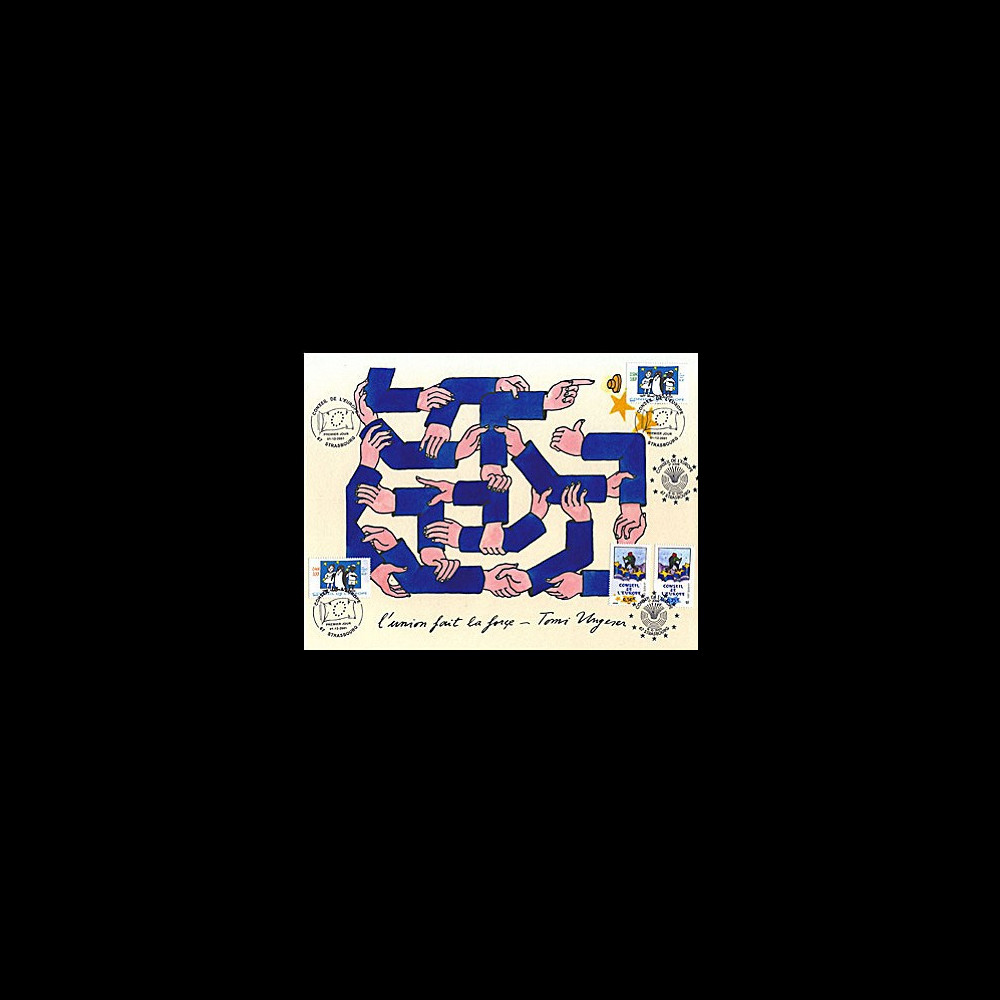 18.10.2003 : Il s'était déjà impliqué dans la conception des timbres de service du Conseil de l'Europe de 2001, mais également en réalisant la maquette du timbre allemand pour le 40e anniversaire du Traité franco-allemand et le voilà qui récidive. Une nouvelle fois Tomi Ungerer répond présent à la demande de l'Europe et signe pour la seconde fois la série des timbres consacrés au Conseil de l'Europe.