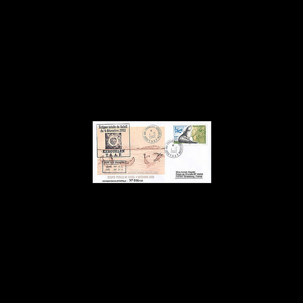 Pli affranchissement TAAF «Otarie, suivi océanographique» oblitération Port-aux-Français, Kerguelen 4.12.02 + cachet spécial TAAF «Eclipse totale de Soleil 4.12.2002, Kerguelen» + liaison postale «Conseil de l'Europe». Tirage N°1/100
