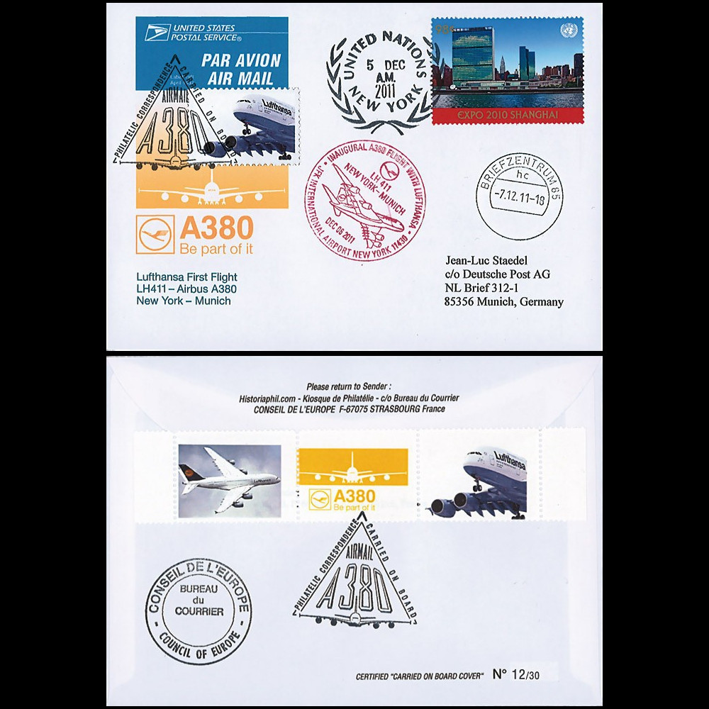 + flight cachet New York JFK “Inaugural A380 Flight LH411“ dated December 6, 2011