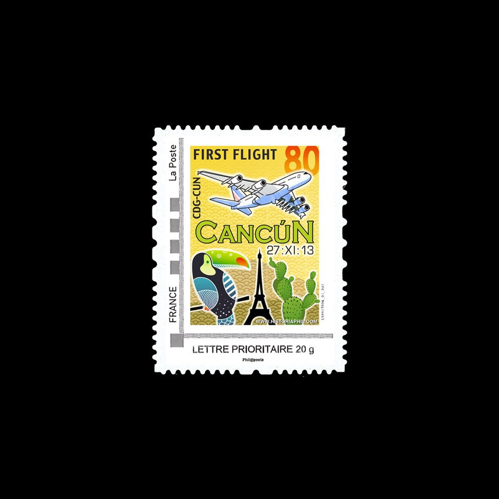 No. A380-235N : FRANCE 1 value Personalized stamp Priority letter 20g YELLOW "November 27, 2013 : First Flight Airbus A380 Air France AF 650 Paris CDG (France) - Cancún CUN (Mexico) - Primer Vuelo Paris-Cancún : 80th anniversary of Air France in Mexico" 2013 :