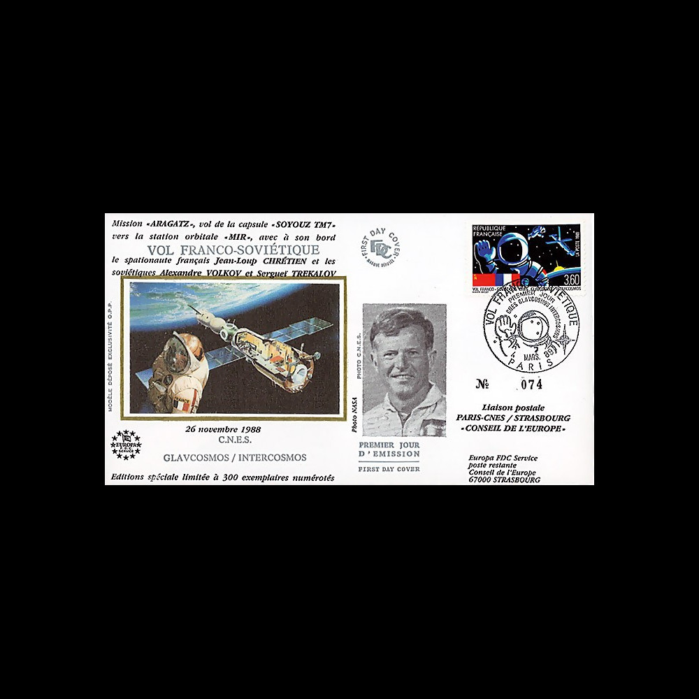N°ARAGATZ88-1 : FDC FRANCE "Mission ARAGATZ - Jean-Louis CHRÉTIEN / March 4, 1989 : First Day in Paris (France) - Franco-soviet Flight CNES - GLAVKOSMOS" 1989 :