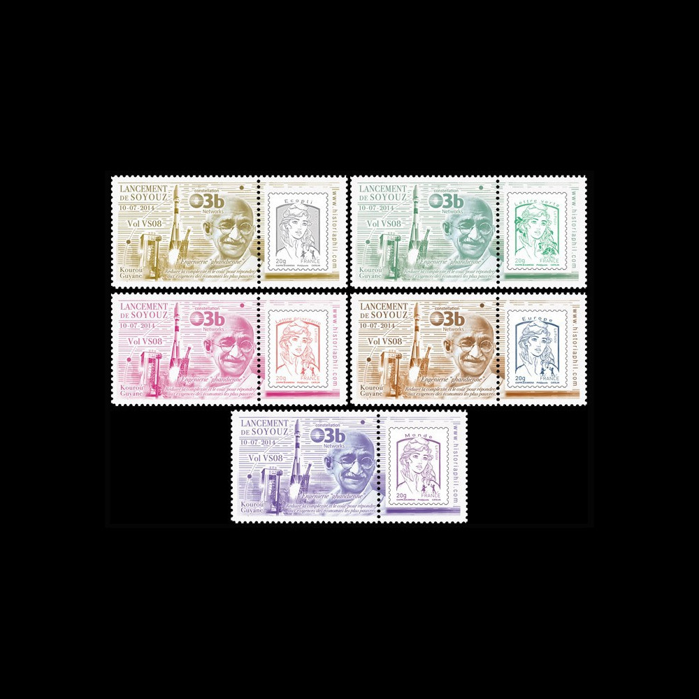 N°VS08L-PT1/5 : FRANCE Set of 5 values "Marianne and Youth, 2014" on Private Stamp Display Units perforated and gummed "July 10, 2014 : Launching SOYUZ Rocket - Flight No. 8 / Arianespace to Launch four additional Networks satellites - Constellation O3b - "Gandhian" engineering / Mahatma GANDHI, India" 2014 :