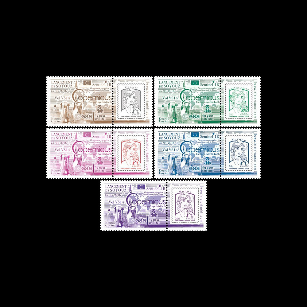 N°VS14L-PT1/5 : FRANCE Set of 5 values "Marianne and Youth" on Private Stamp Display Units perforated and gummed "April 25, 2016 : Launching SOYUZ Rocket - Flight No. 14 / Arianespace to Launch the Earth Observation Satellite SENTINEL-1B - COPERNICUS : European programof monitoring to track in real time the status of the Earth planet"