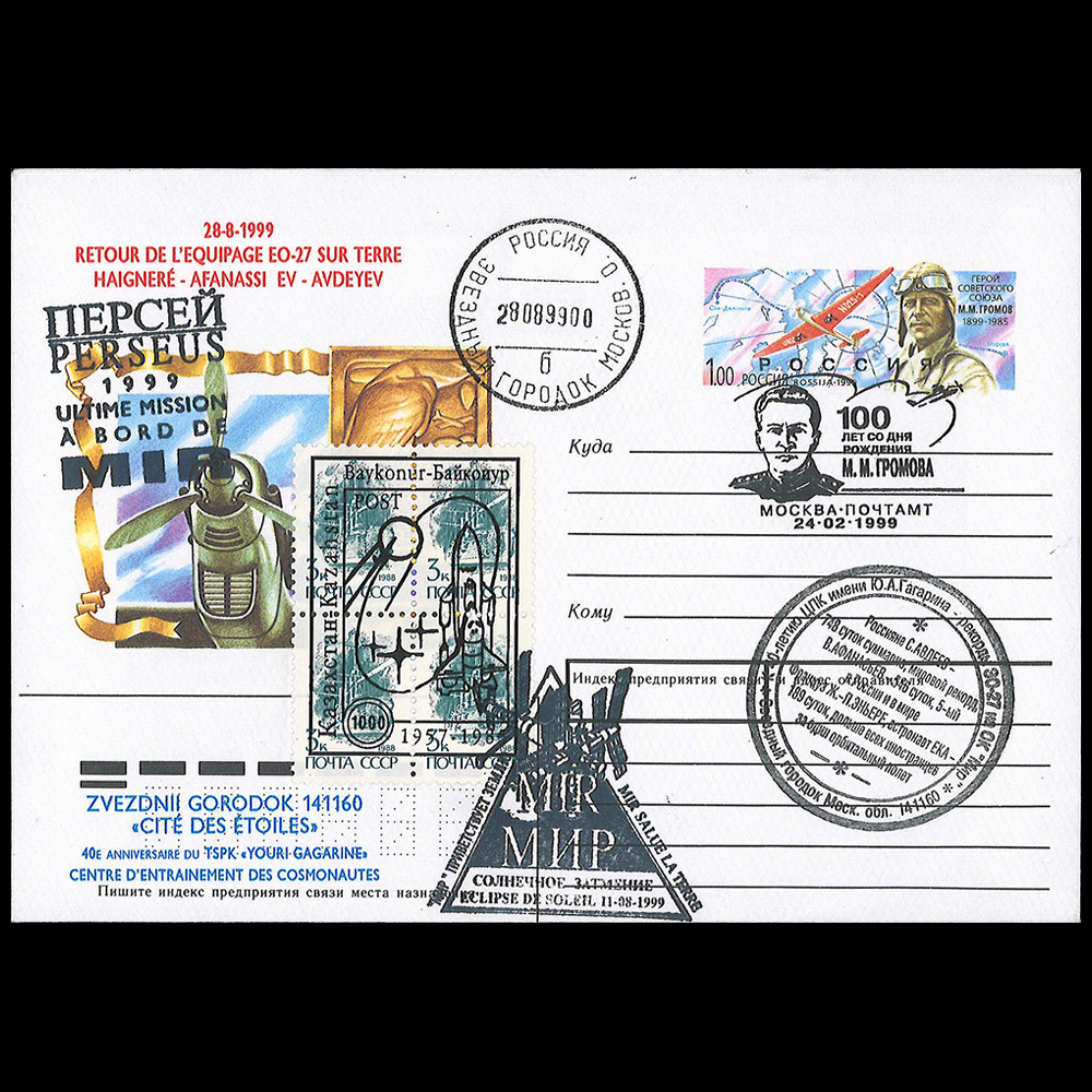 No. MIR99-10B: postal stationery Russia 'Franco-Russian mathematician and aviator Mikhail Gromov (1899 - 1985)' “Franco-Russian PERSEUS Mission 20.02-28.08.1999 - LAST MISSION ABOARD MIR - return of EO-27 crew Haigneré (F), Afanasyev, Avdeyev (RU)”
