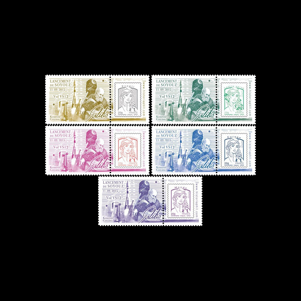 N°VS12L-PT1/5 : FRANCE - Set of 5 values "Marianne and Youth, 2015" on Private display units perforated and gummed "September 11, 2015 : Launching SOYUZ Rocket - Flight No. 12 / Arianespace to Launch two additional FOC M3 satellites (Full Operational Capacity Mission 3) : "ALBA" & "ORIANA" - Constellation GALILEO" 2015 :