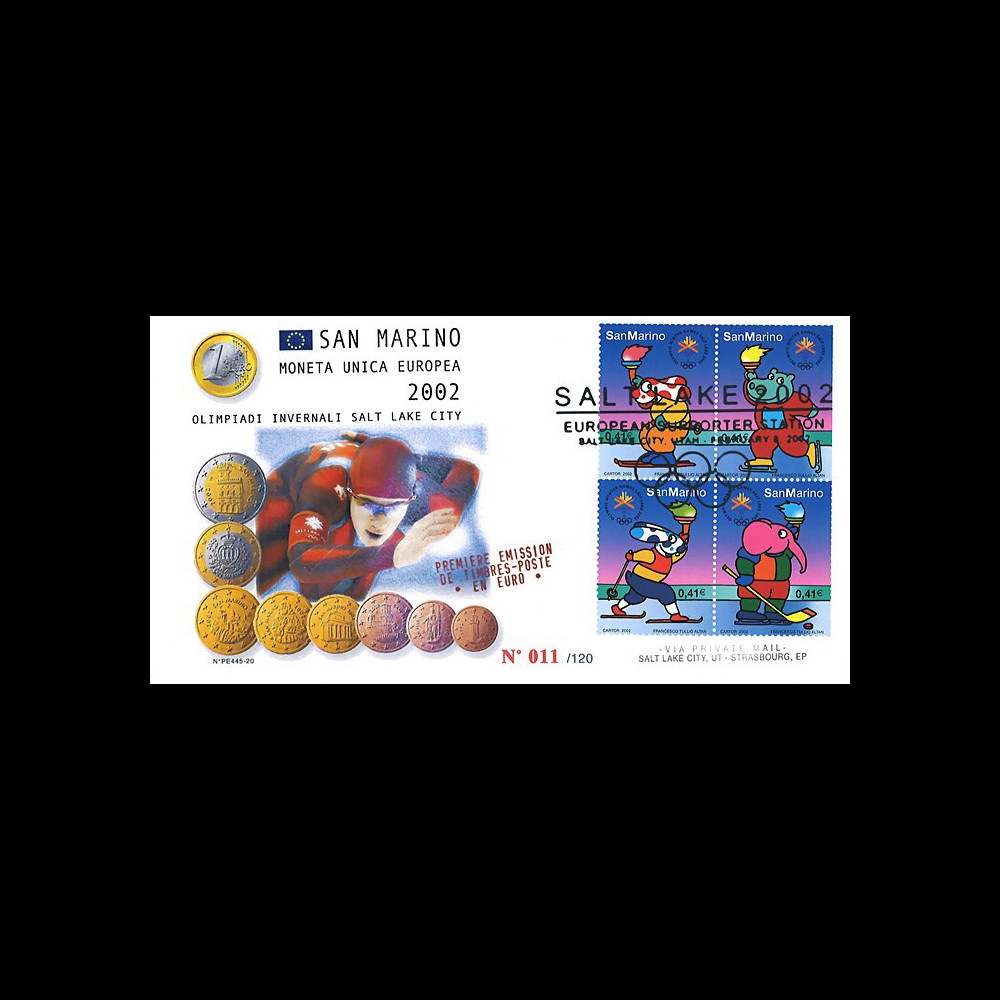 PE445-20 : SAN MARINO FDC 1st Day of the block of 4 values 0,41€ “Passage to the EURO 1st stamps in EURO / Salt Lake City Olympic Games 2002 (USA)“