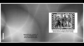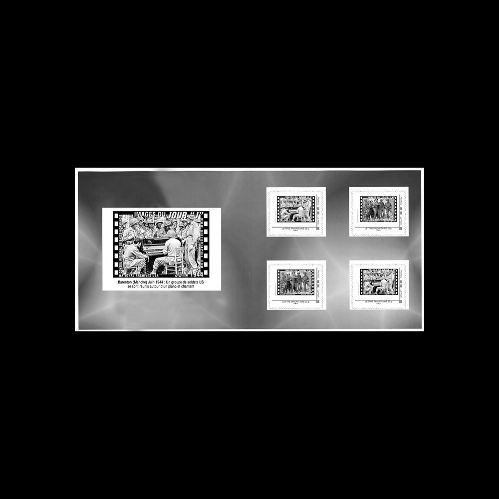N°DEBS1-4C : FRANCE Collector Booklet of 4 values Personalized Stamps Priority Letter 20g "D-Day Photograph June 1944 - Serie Nr 1 / Barenton (Manche, France) June 1944 : American Soldiers Singing & Argentan (Orne, France) June 1944 : In Ruins, American Soldiers around H.C. Medley playing accordion / D-Day 67th anniversary" (unfolded) 2011 :
