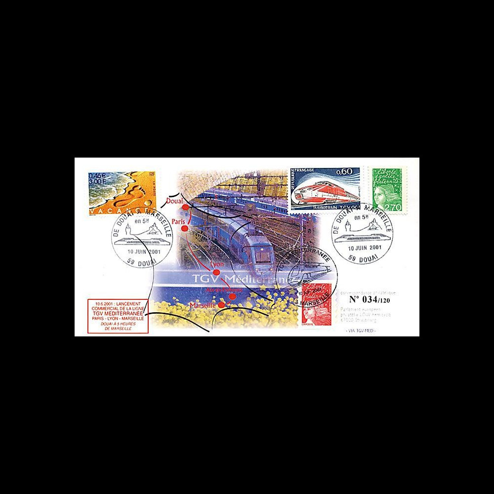 N°TGV-MED3 : FDC FRANCE "June 10, 2001 : Commercial Launching of the French Mediterranean TGV (High-Speed Train) by North-South Link Douai (France) - Paris (France) - Lyon (France) - Aix-en-Provence (France) - Marseille (France)" :