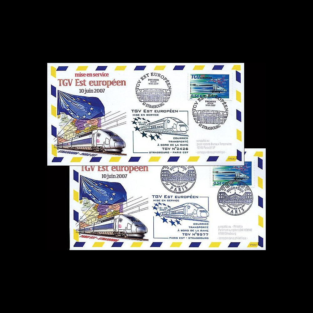 N°PE539-1/2 : Set of 2 FDC FRANCE carried on board "June 9, 2007 : First Day in Strasbourg (France) / June 10, 2007 : Commissioning of the French East European TGV (High-Speed Train) Nr. 9577 Paris Est (France) - Strasbourg (France) & Nr. 2426 Strasbourg (France) - Paris Est (France)" by French East European TGV :