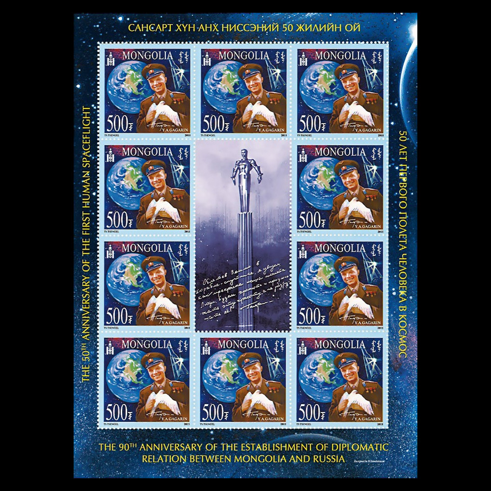 GAGARIN11-3BN : Sheetlet of 10 values MONGOLIA 500T "Yuri GAGARIN with a dove - 50th anniversary of the First Manned Spaceflight / 90th anniversary of the Mongolian and Russian Diplomatic Relations" 2011