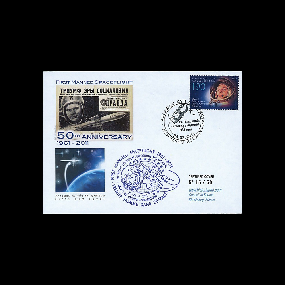 Franked Kazakhstan 1 value 190 "Yuri Gagarin - 50th anniversary of the First Manned Spaceflight" postmarked in Almaty "First Day - 50th anniversary of the First Manned Spaceflight - Spaceship VOSTOK-1" (Kazakhstan) dated February 24, 2011