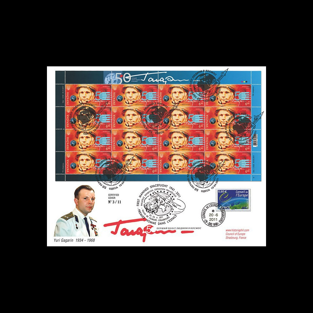 + Black cachet Strasbourg "Gagarin - Philatelic Exposition First Manned Spaceflight 1961-2011 / Council of Europe" dated June 20-24, 2011