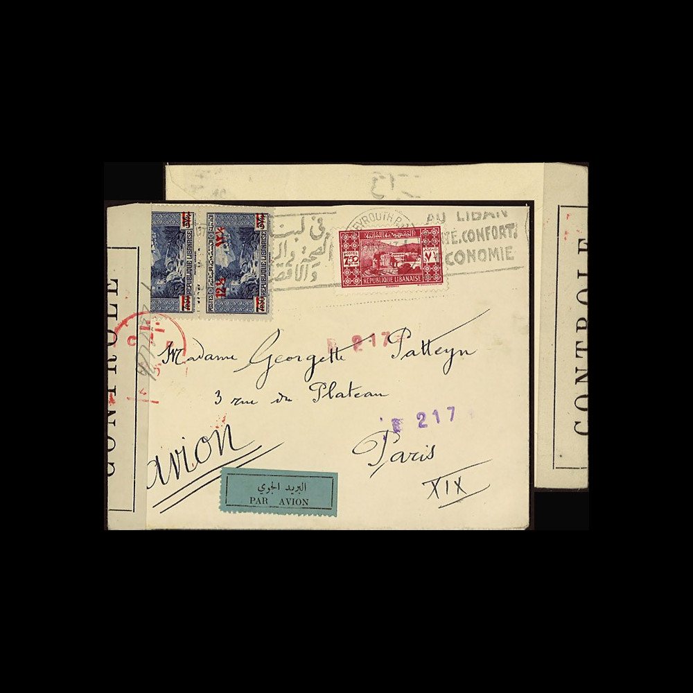 N°W2-LIB0148 : Aircraft Cover LEBANON with Free French Forces Postal censor mark bound for France (1944) :